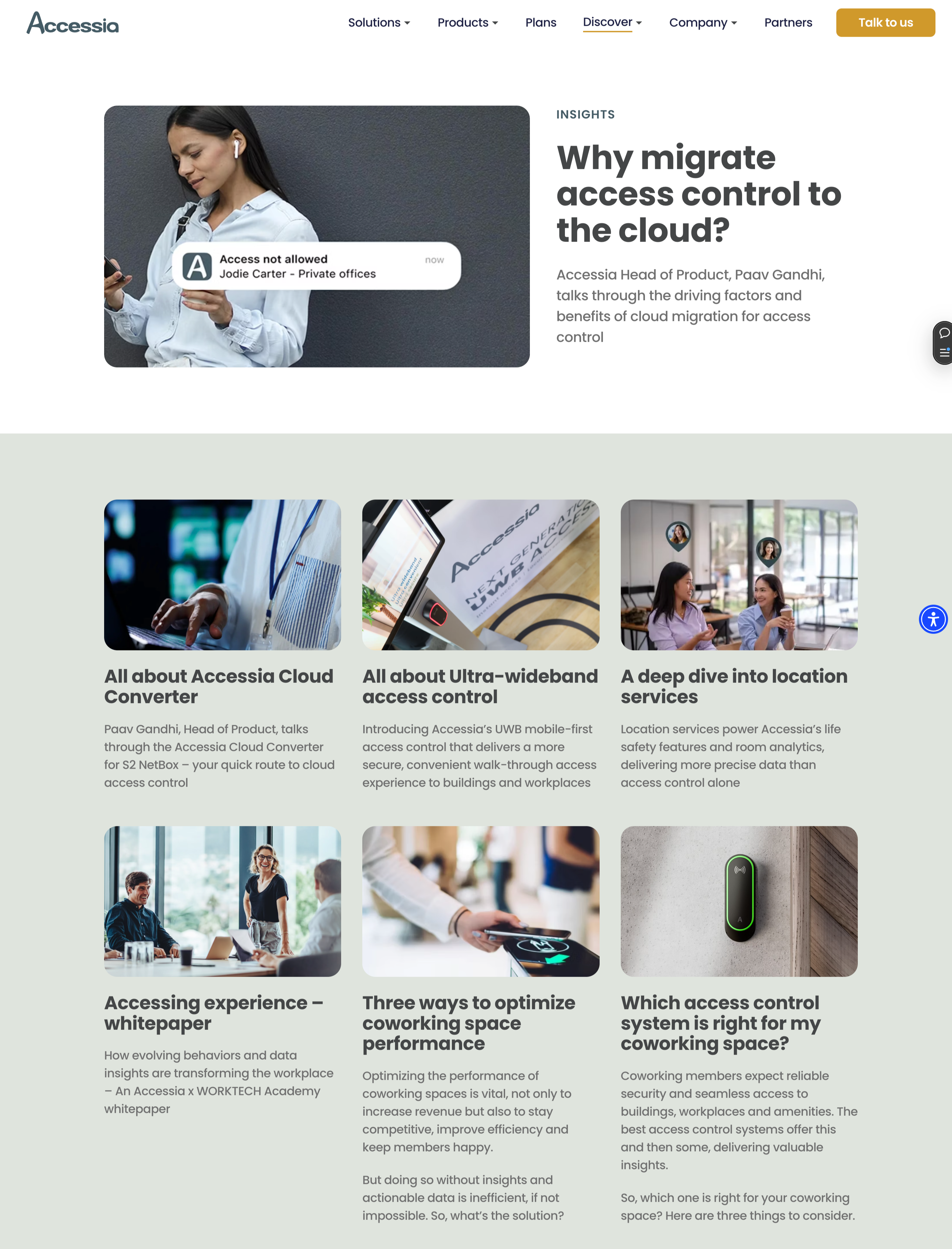 Accessia is a cloud platform that helps organizations manage physical security from end to end. It uses modern Ultra-wideband technology to provide touch-free access, location services for safety, and tools like visitor management and booking-based access.